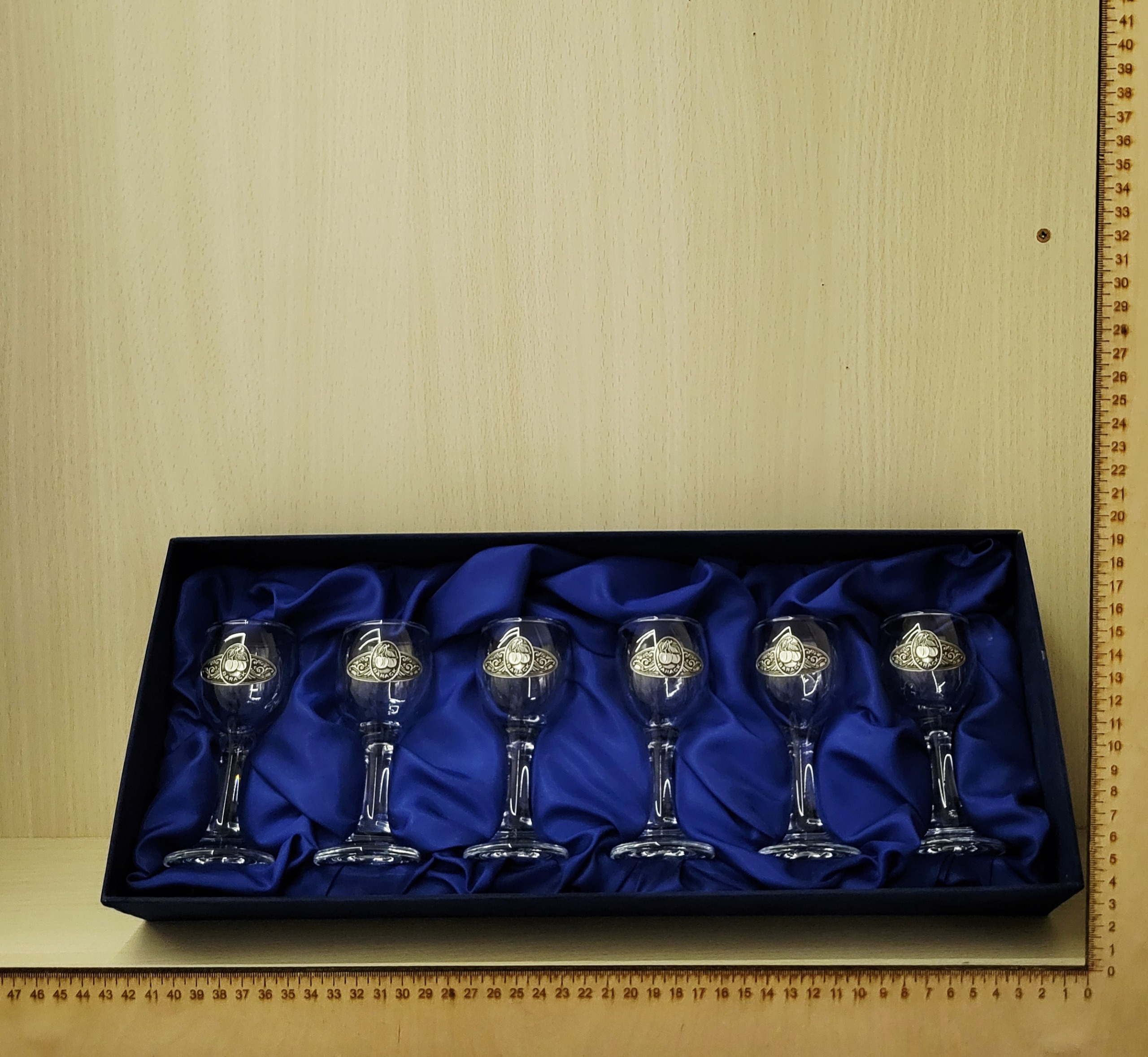 6 db likőrös, pálinkás pohár fém címkével bársony dobozban