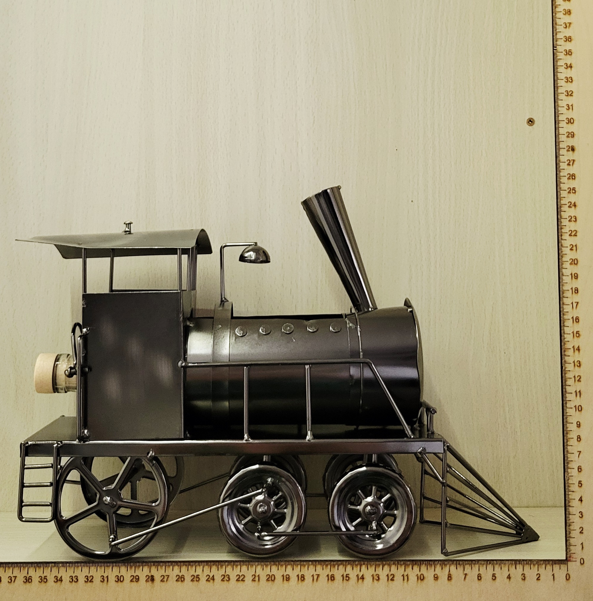 Mozdony alakú fém bortartó, újrahasznosított anyagok felhasználásából