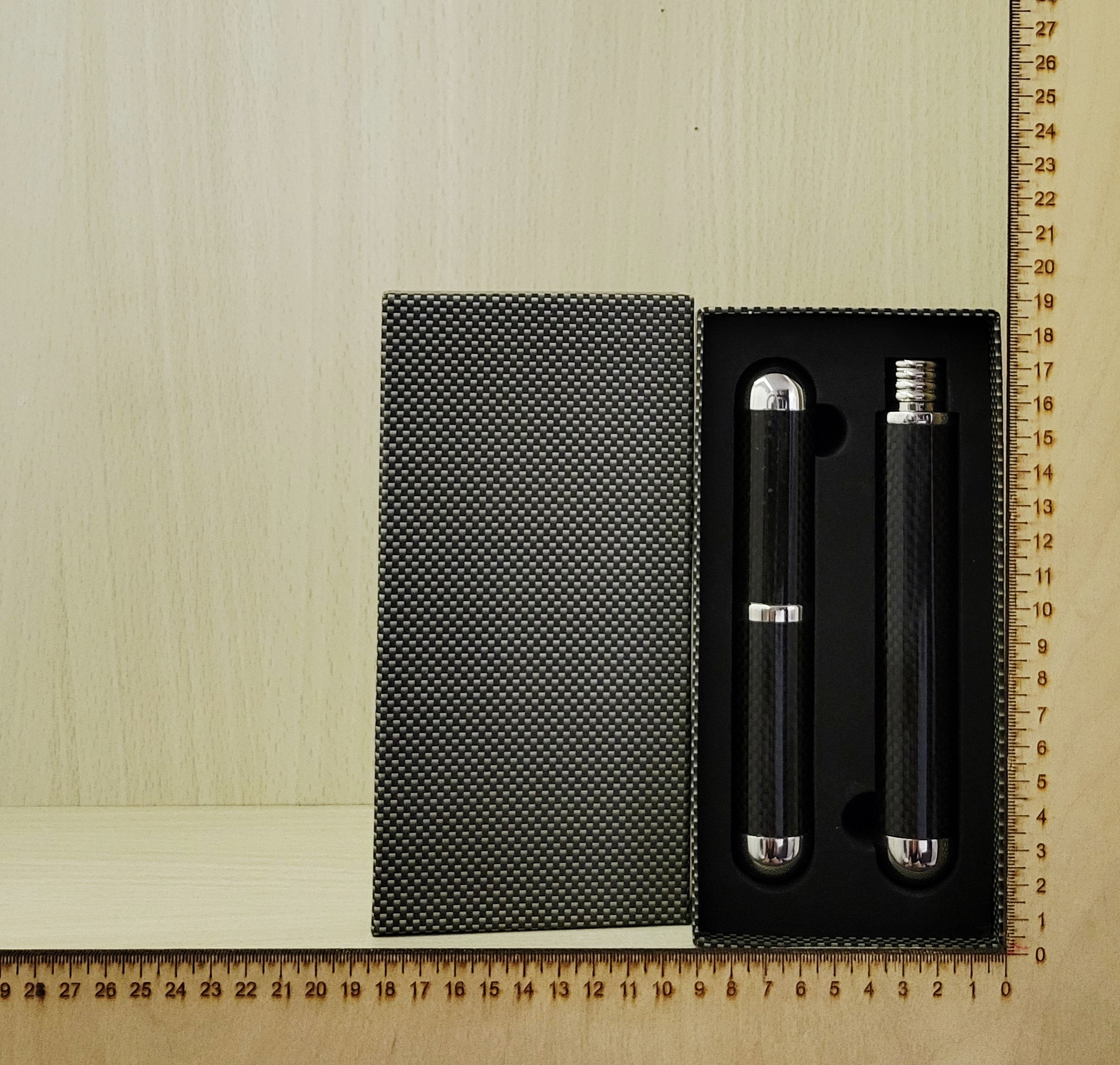 Acél / Carbon-szálas  szivartartó & flaska díszdobozban
